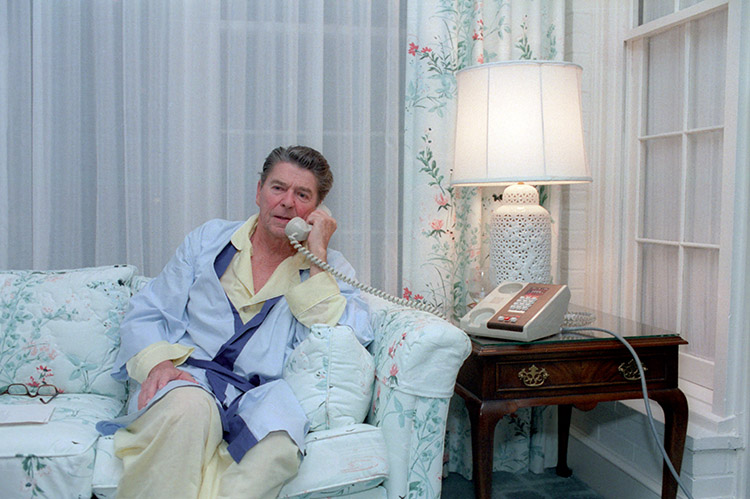 C17824-5 Published July 27, 2018 at 750 × 499 in Operation Urgent Fury, Cold War Crisis in Grenada, October – November 1983 ← Previous Next → 10/22/1983 President Reagan making an early morning telephone call to staff regarding the situation in Grenada at Eisenhower cabin at the Augusta National Golf course in Georgia