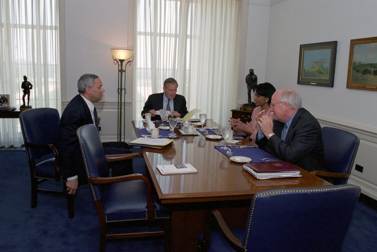 U.S. Secretary of Defense, the Honorable Donald H. Rumsfeld, center, hosts a working lunch with U.S. Secretary of State, the Honorable Colin L. Powell, left, U.S. National Security Advisor, the Honorable Condoleezza Rice, and U.S. Vice President, the Honorable Richard B. Cheney, right, at the Pentagon, Washington, D.C., on May 2, 2001.OSD Package No. 010502-D-2987S-001 to 007 (Photo by Helene C. Stikkel) (Released)