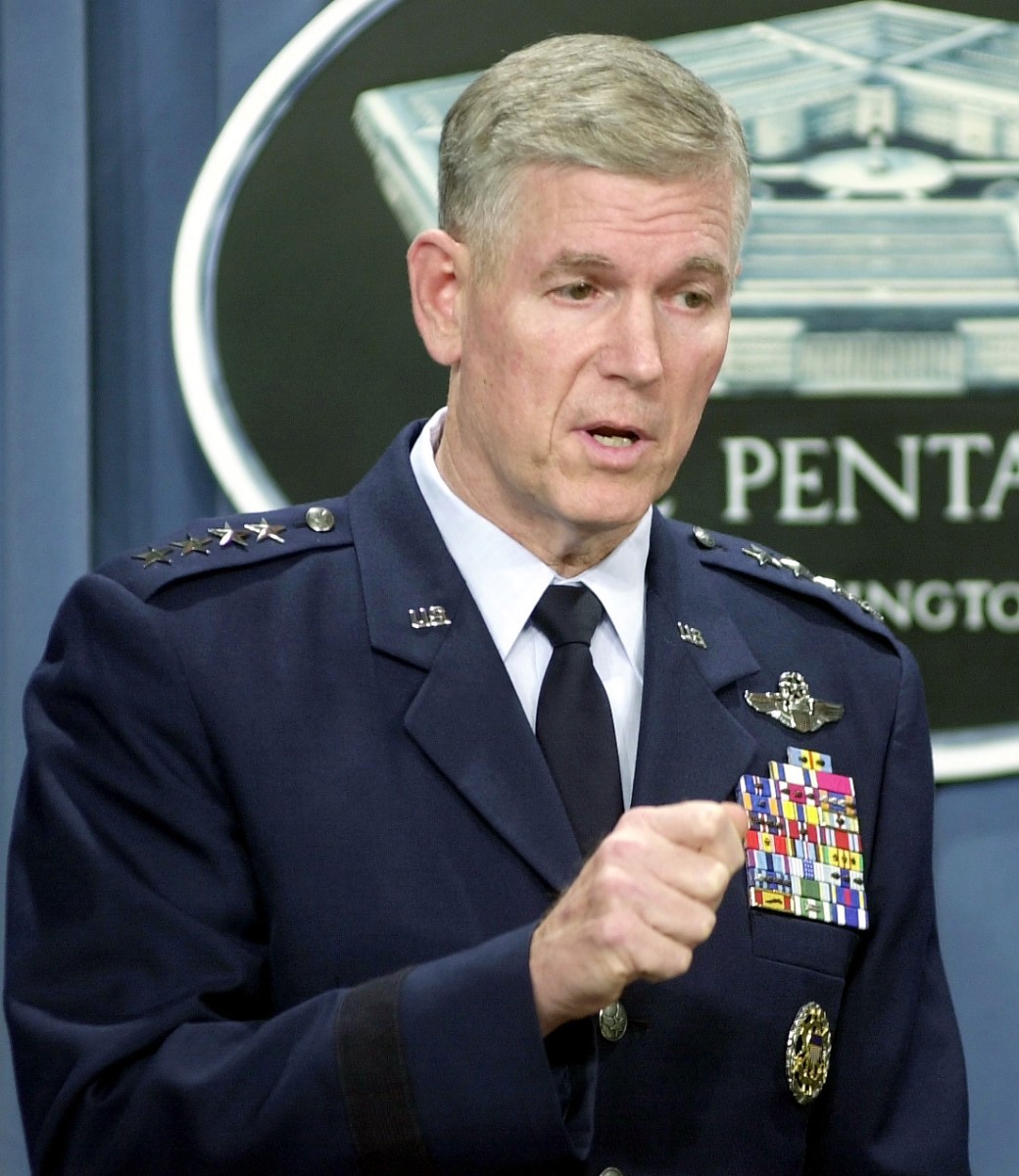 Chairman of the Joint Chiefs of Staff (JCS) US Air Force General (GEN) Richard B. Myers briefs reporters during a Pentagon press briefing, October 9, 2001. The briefing covered battle damage assessment on the second day of bombing raids and an analysis of the delivery of humanitarian food aid to regions in Afghanistan during Operation ENDURING FREEDOM.