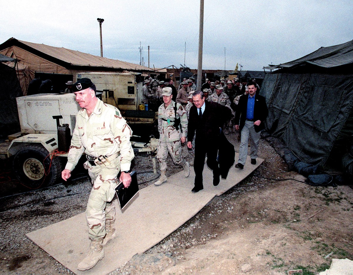 U.S. Army Col. John Mulholland, Commander, 5th Special Forces Group, lead The Honorable Donald H. Rumsfeld, U.S. Secretary of Defense, and his official party to meet U.S. Army Soldiers of the 10th Mountain Division and U.S. Air Force at Bagram Air Base, Afghanistan, Dec. 16, 2001, currently deployed in support of Operation Enduring Freedom. (DoD photo by Helene C. Stikkel) (Released)