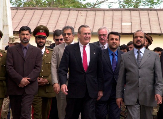 The Honorable Donald H. Rumsfeld (front, center), U.S. Secretary of Defense, arrives at the Islamic Republic of Afghanistan Presidential Palace, in Kabul, Kabul Province, Afghanistan, on April 27, 2002, for a tour and to meet with several different Afghan Interim Administration officials during Operation Enduring Freedom. (DoD photo by Staff Sgt. James J. Connolly, Jr.) (Released)