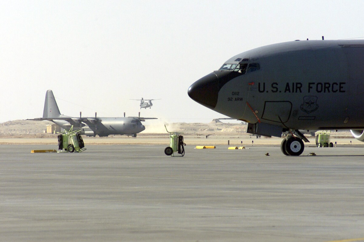 A British Royal Air Force CH-47 arrives from a mission while an Air Force KC-135R, 92nd Air Refueling Wing, and British Royal Air Force EC-130 Hercules are at their parking spots on the ramp at Thumrait Air Base, Oman, during Operation ENDURING FREEDOM. In response to the terrorist attacks on September 11, 2001 at the New York World Trade Center and the Pentagon, President George W. Bush initiated Operation ENDURING FREEDOM in support of the Global War on Terrorism (GWOT), fighting terrorism abroad.