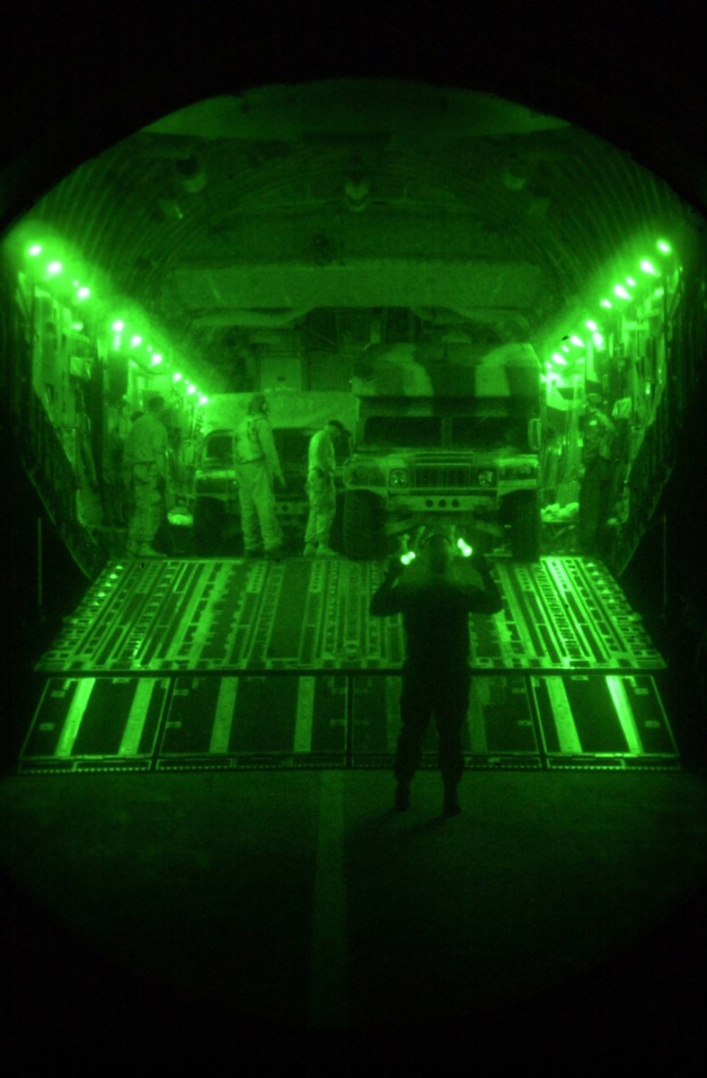 Members of the 715th and 815th Tanker Airlift Control Element (TACE), Travis AFB, California, download vehicles and cargo from a C-17 Globemaster III at a forward operating location. Members of the 615th TALCE forward deployed to several locations in support of Operation ENDURING FREEDOM. In response to the terrorist attacks on September 11, 2001 at the New York World Trade Center and the Pentagon, President George W. Bush initiated Operation ENDURING FREEDOM in support of the Global War on Terrorism (GWOT), fighting terrorism abroad.