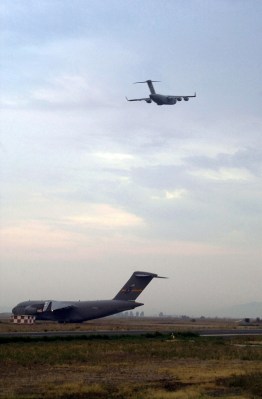 At dawn as one C-17A Globemaster III launches on a mission another waits on the taxiway for its turn at Naval Air Station (NAS) Sigonella, Italy. The aircraft are carrying troops and cargo to forward locations in support of Operation ENDURING FREEDOM. In response to the terrorist attacks on September 11, 2001 at the New York World Trade Center and the Pentagon, President George W. Bush initiated Operation ENDURING FREEDOM in support of the Global War on Terrorism (GWOT), fighting terrorism abroad.