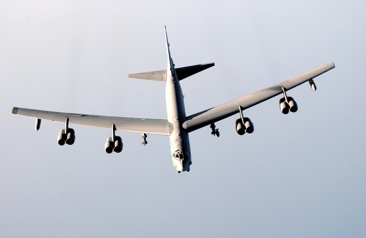 A B-52H Stratofortress from the 28th Air Expeditionary Wing heads back, with an unused GBU-32 (Mk-84 2,000-pound bomb) JDAM (Joint Direct Attack Munition), to Diego Garcia after a successful bombing mission over Afghanistan during Operation ENDURING FREEDOM. In response to the terrorist attacks on September 11, 2001 at the New York World Trade Center and the Pentagon, President George W. Bush initiated Operation ENDURING FREEDOM in support of the Global War on Terrorism (GWOT), fighting terrorism abroad.