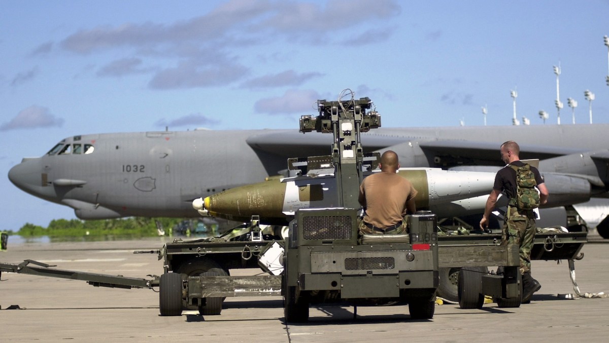 Air Force munitions specialists from the 28th Air Expeditionary Wing use an MHU-83 C/E Munitions Loader to download Joint Direct Attack Munitions (JDAM) based on the Mk-84 2,000-pound bomb, from a B-52 bomber and place it on munitions cart during Operation ENDURING FREEDOM. In response to the terrorist attacks on September 11, 2001 at the New York World Trade Center and the Pentagon, President George W. Bush initiated Operation ENDURING FREEDOM in support of the Global War on Terrorism (GWOT), fighting terrorism abroad.
