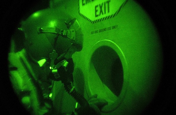 An Air Force C-17 Globemaster III loadmaster looks outside, into the night sky, before dropping his cargo of Tri-Wall Aerial Delivery System (TRIADS) loaded with Humanitarian Daily Rations (HDRs). Air Force C-17s delivered HDRs in Support of ENDURING FREEDOM from Germany to Afghan refugees who have massed inside the borders of Afghanistan. The C-17s carried over 35,000 HDRs packaged in 84 TRIAD boxes, measuring 80 inches tall and 48 by 48 inches square, each filled with 420 HDRs. The HDRs were delivered in a first of its kind, high altitude airdrop. This is the first operational TRIAD delivery from C-17 aircraft and the first combat airdrop mission performed by a C-17. In addition to the humanitarian efforts, Operation ENDURING FREEDOM is in support of the Global War on Terrorism (GWOT), fighting terrorism abroad, after the terrorist attacks on September 11, 2001 at the New York World Trade Center and the Pentagon. The US is continuing its build up of forces in the region in case of a military response to the terrorist attacks. (Duplicate image, see also DFSD0317245 or search 011006F1644L028)