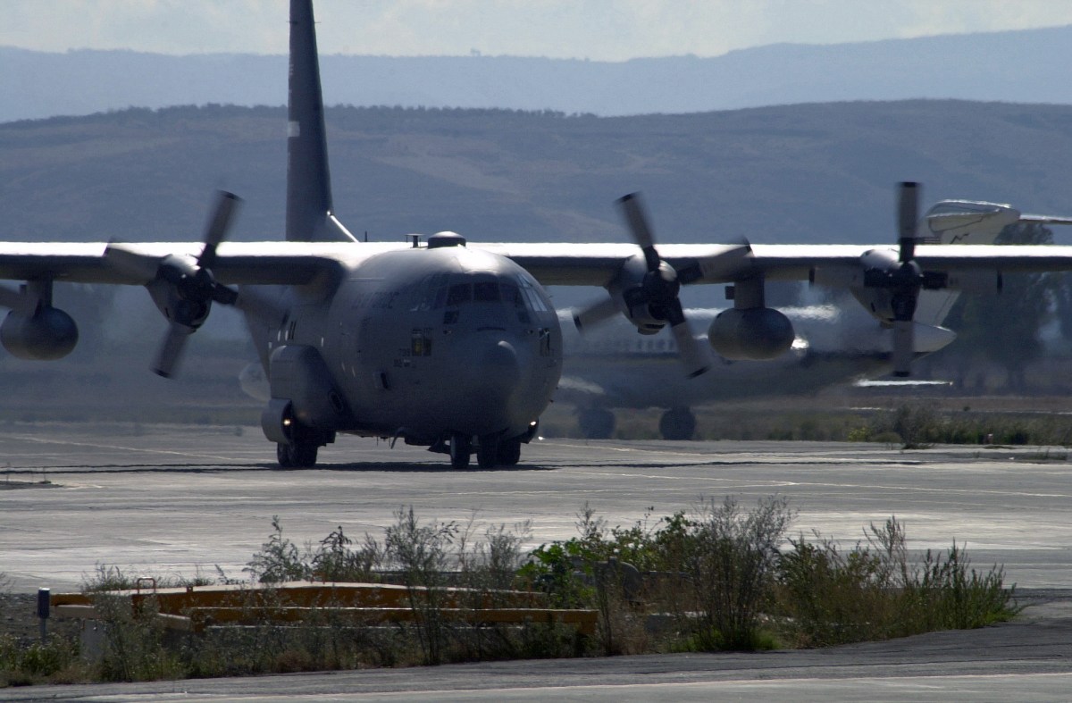 C-130 Hercules from Peterson Air Force Base, Colorado, taxies onto the ramp at Naval Air Station Sigonella during Operation ENDURING FREEDOM. In response to the terrorist attacks on September 11, 2001 at the New York World Trade Center and the Pentagon, President George W. Bush initiated Operation ENDURING FREEDOM in support of the Global War on Terrorism (GWOT), fighting terrorism abroad.