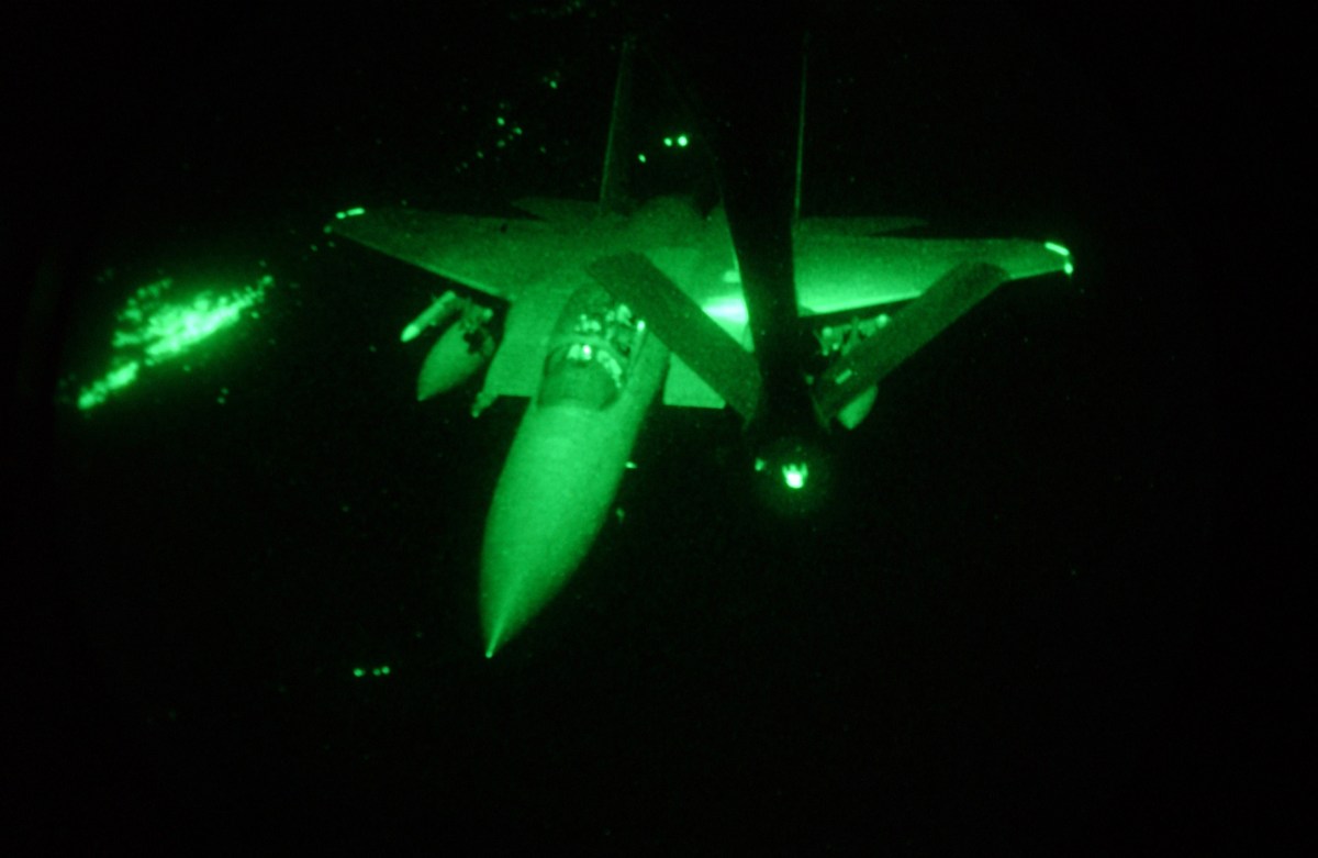 Refueling missions are part of the nighttime air strikes on Afghanistan. Here an F-15 Strike Eagle, seen through the green glow of a night scope, moves in to make contact with a KC-135R from the 319th Air Expeditionary Group (AEG) in the night skies over Afghanistan. The 319th AEG deployed to a forward operating location to provide air-to-air refueling in support of Operation ENDURING FREEDOM. In response to the terrorist attacks on September 11, 2001 at the New York World Trade Center and the Pentagon, President George W. Bush initiated Operation ENDURING FREEDOM in support of the Global War on Terrorism (GWOT), fighting terrorism abroad.