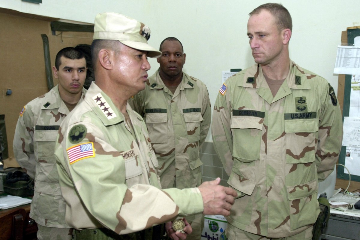 Lieutenant Colonel Ron Corkran, USA, (right), Commander TF 1-187, listens to General Eric Shinseki, Army Chief of Staff, speak about security issues the task force faces at the forward operating location where they are deployed. General Shinseki made an unscheduled stop at the location to discuss issues affecting the military service members deployed there as part of Operation ENDURING FREEDOM. Listening behind them to the discussion is Master Sergeant Oliver, USA, (right) and Specialist Osuna, USA. In response to the terrorist attacks on September 11, 2001 at the New York World Trade Center and the Pentagon, President George W. Bush initiated Operation ENDURING FREEDOM in support of the Global War on Terrorism (GWOT), fighting terrorism abroad.