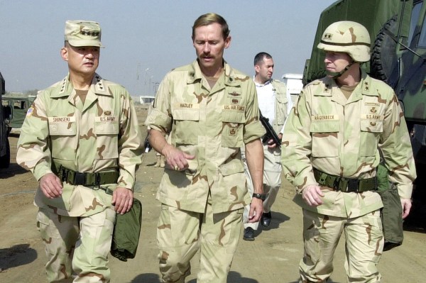 Lieutenant Colonel Steven Hadley, USAF, (center), 16th Special Operations Wing (Deployed) Operations Group Commander, talks with General Eric K. Shinseki, USA, (left), about the special operations mission at a forward deployed operating location. General Shinseki made an unscheduled stop at the location to discuss issues affecting the military service members deployed there as part of Operation ENDURING FREEDOM. In response to the terrorist attacks on September 11, 2001 at the New York World Trade Center and the Pentagon, President George W. Bush initiated Operation ENDURING FREEDOM in support of the Global War on Terrorism (GWOT), fighting terrorism abroad.