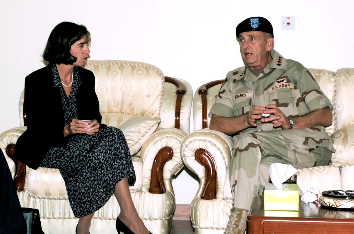General Tommy Franks, Commander US Central Command, MacDill AFB, Florida, speaks with Madam Ambassador Maureen Quinn, US Ambassador to Qatar on matters of Operation ENDURING FREEDOM. General Franks met with the Ambassador while on a tour of the bases around the Persian Gulf during Operation ENDURING FREEDOM. In response to the terrorist attacks on September 11, 2001 at the New York World Trade Center and the Pentagon, President George W. Bush initiated Operation ENDURING FREEDOM in support of the Global War on Terrorism (GWOT), fighting terrorism abroad.