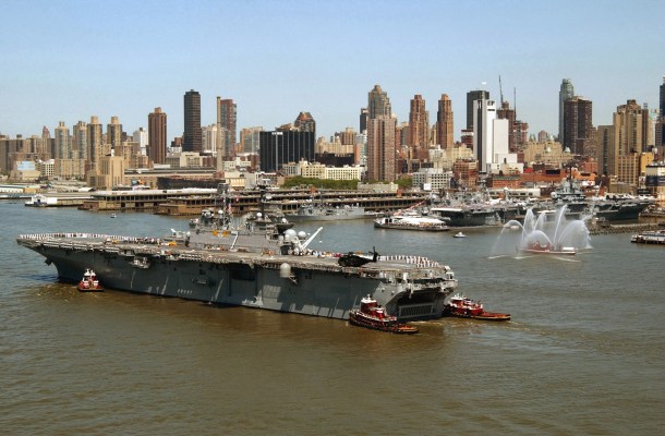 Tugboats maneuver the multi-purpose WASP class Amphibious Assault Ship USS IWO JIMA (LHD 7) toward Pier 88 in New York City. The IWO JIMA arrived to celebrate Fleet Week 2002. More than 6,000 Sailors, Marines and Coast Guard personnel aboard 22 ships – including six warships returning from deployment in support of Operation ENDURING FREEDOM, sail into New York City for the 15th Annual Fleet Week 2002.