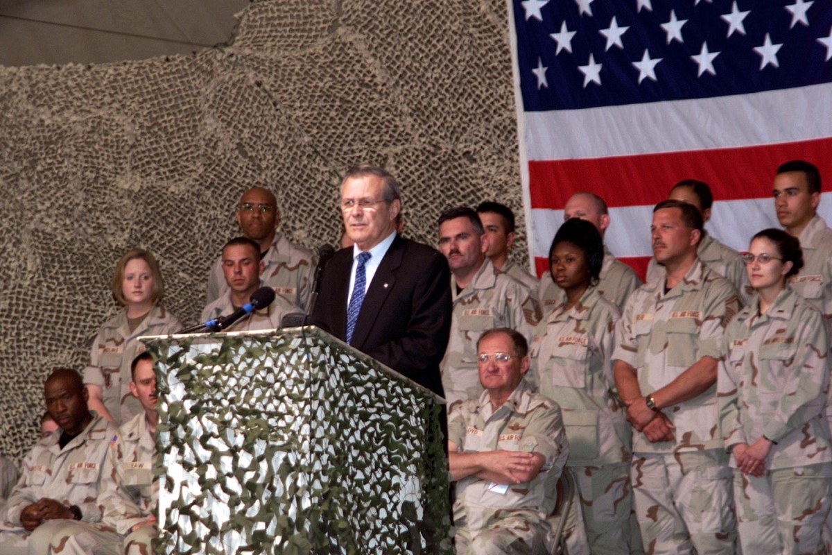 Secretary of Defense Donald H. Rumsfeld addresses a crowd of more than 500 coalition members during a town hall meeting at a deployed site in Kyrgyzstan, April 26, 2002. This was the first stop on the Secretary’s tour of deployed locations in Central Asia. (U.S. Air Force photo by Staff Sgt. Mary Stuckey) (Released)