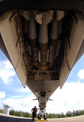 View of a B-1B Lancer bomb bay loaded with Joint Direct Attack Munition (JDAM) based on a BLU-109 2,000-pound bombs, for support of Operation ENDURING FREEDOM. In response to the terrorist attacks on September 11, 2001 at the New York World Trade Center and the Pentagon, President George W. Bush initiated Operation ENDURING FREEDOM in support of the Global War on Terrorism (GWOT), fighting terrorism abroad.