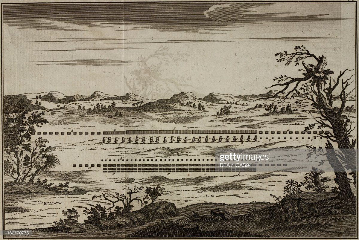Battle of Tunis between Xanthippus and Regulus (255 BC), First Punic War, Plate XXXII, engraving by K de Putter, from Histoire de Polybe (The Histories by Polybius), Volume I, 1774, Amsterdam. (Photo by Icas94 / De Agostini Picture Library via Getty Images)